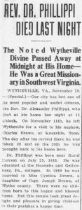 In his obituary on the front page of the Pulaski Southwest Times of November 29, 1915 it was said, “Our city has lost one of its most popular and useful citizens, the Rev. Alexander Phillippi, who died at his home last night at 11 o’clock. … His first pastorate in the Lutheran church was at Charlotte, N.C., where he built the first Lutheran church ever erected in that city. … Thus ended a long and useful life. A man for whom all people had the greatest respect. Many people now on earth, and multitudes who have passed to the Great Beyond, will rise up and call him blessed”.